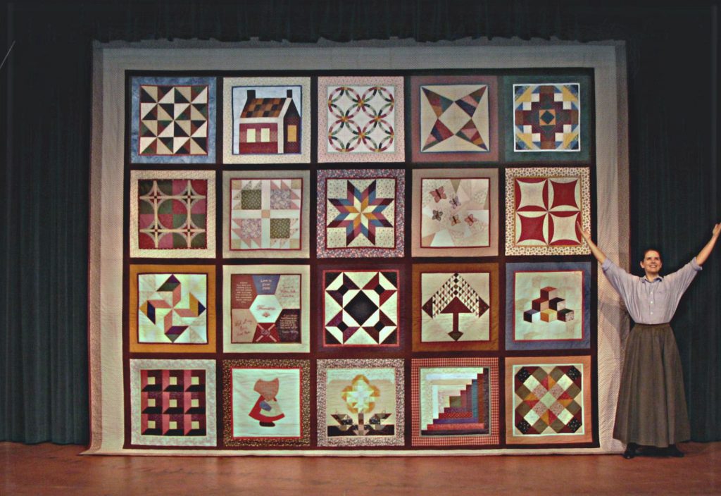 The large legacy quilt measures 16.2’ wide x 13.4’ tall and includes the 17 large blocks specific to the play, Quilters, plus 3 blocks that we added to the legacy quilt, which are all appropriate to the play. The 3 ‘extra’ quilt blocks are: